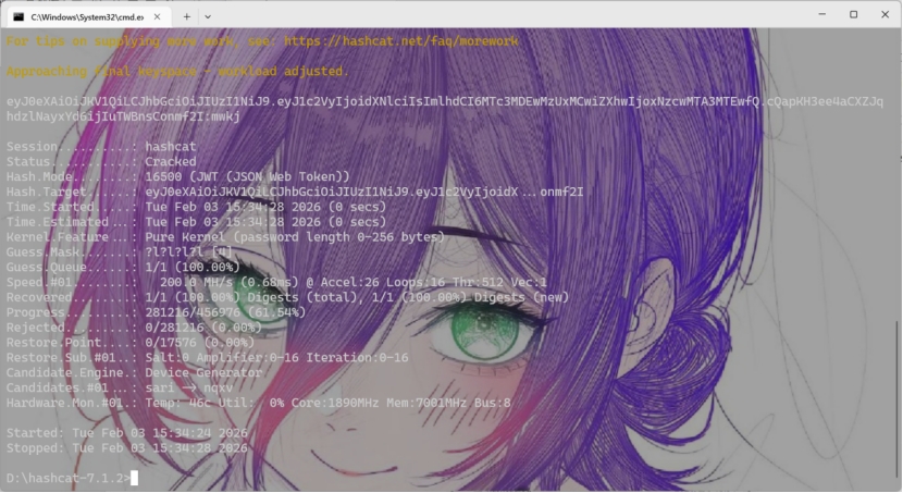 1 | hashcat -m 16500 token.txt -a 3 ?l?l?l?l |