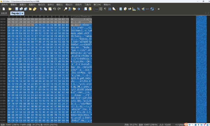 1.flag.zip用010 editor打开,取压缩包除了文件头和文件尾的部分: