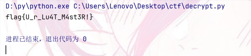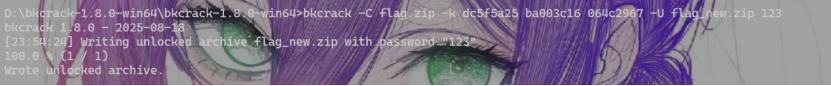 1 | bkcrack -C flag.zip -k dc5f5a25 ba003c16 064c2967 -U flag_new.zip 123 |