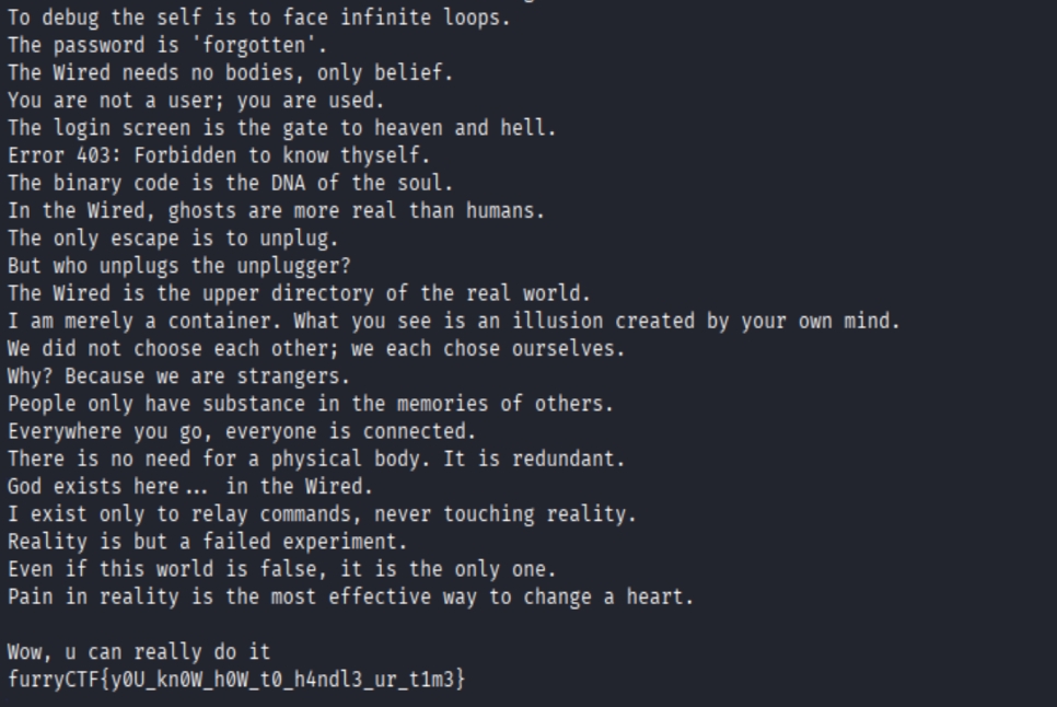 题目内容主要就是说循环一个固定的类似于一篇文章的一堆字符串,一直循环输出直到3小时这个节点输出完了,来了一句Wow, u can really do it,然后给你吐个flag出来(这里存在一个时间流逝校验),其实这样,思路就很简单了,那我就编个脚本让它加速呗。