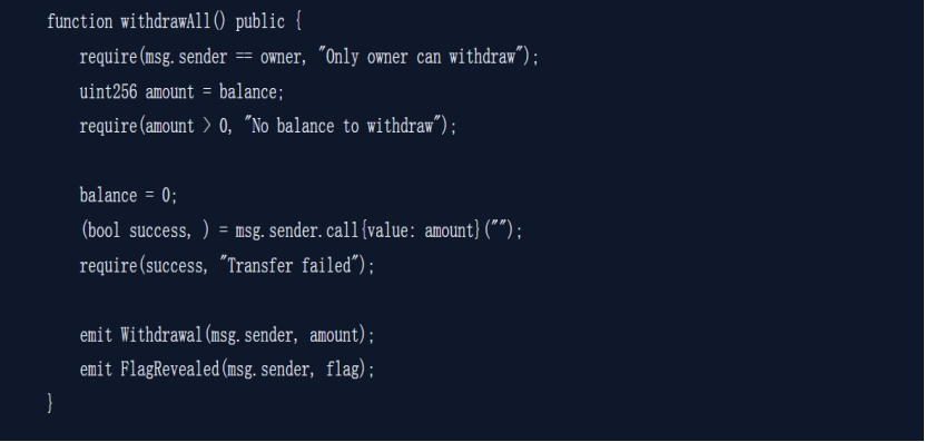 我们的目标很简单:把合约里的钱全取走,拿到 flag!而这需要我们利用合约的漏洞