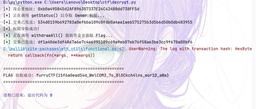 所以接下来的流程就是篡位->取钱,可以开始编脚本了(我喜欢用脚本和网页交互):脚本里根据合约地址下的隐藏ABI编写,出题人建议我们使用web3.js