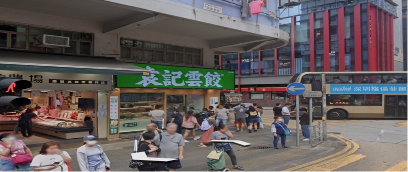 就大概凭借这些特点,你上谷歌搜索也好,百度识图也罢,甚至是豆包,都可以锁定登打士街这个地址,除了这个还是不够的,因为一条街其实还是挺大的,这时候“云饺”这家店派上了用场。我们查查这家店的来头,通过识图搜索,发现这家店的名字是“袁记云饺”,然后去谷歌地球上搜就可以搜到,最终确定这个地方是香港九龙的亚皆老街。