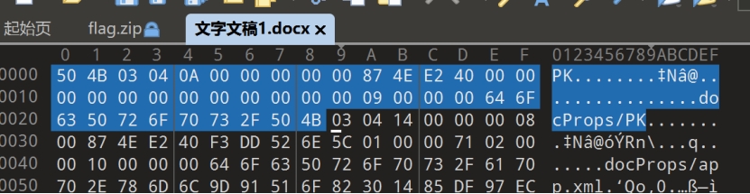 选中区域后,右键->选择->保存选择,另存为一个文件,这里我命名为c.zip,同理我需要对docx进行类似的操作,这里可以新建一个docx,保证与压缩包里那个一样是store压缩方法,这里有一个小坑:在我自己尝试的时候发现word和wps生成的docx文件头有差别,这里选择用wps新建,同样在010 editor里打开,取docx的文件头一部分(可以多一点):